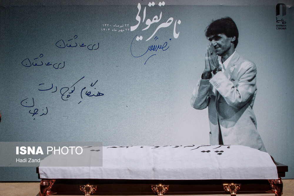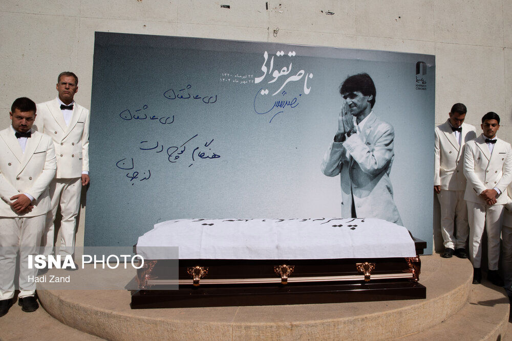 ایران آرت: صبح امروز ۲۴ مهرماه ۱۴۰۴ پیکر ناصر تقوایی با نوای سنج و دمام از ساختمان شماره ۲ خانه سینما به امام زاده طاهر کرج بدرقه شد. بسیاری از حاضران در این مراسم از جمله هنرمندان، طبق وصیت ناصر تقوایی، در این مراسم با لباس سفید حضور پیدا کردند.