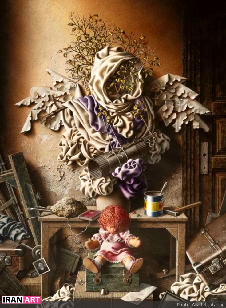 Khakdan’s pictorial realm is deeply rooted in childhood, nostalgia, and recollections that have accompanied him throughout his artistic journey. Through masterful technique and poetic sensibility, he creates atmospheric scenes where everyday objects—dolls, faded photographs, withered flowers, and ownerless garments—are transformed into evocative subjects, narrating tales of absence, loss, and longing.