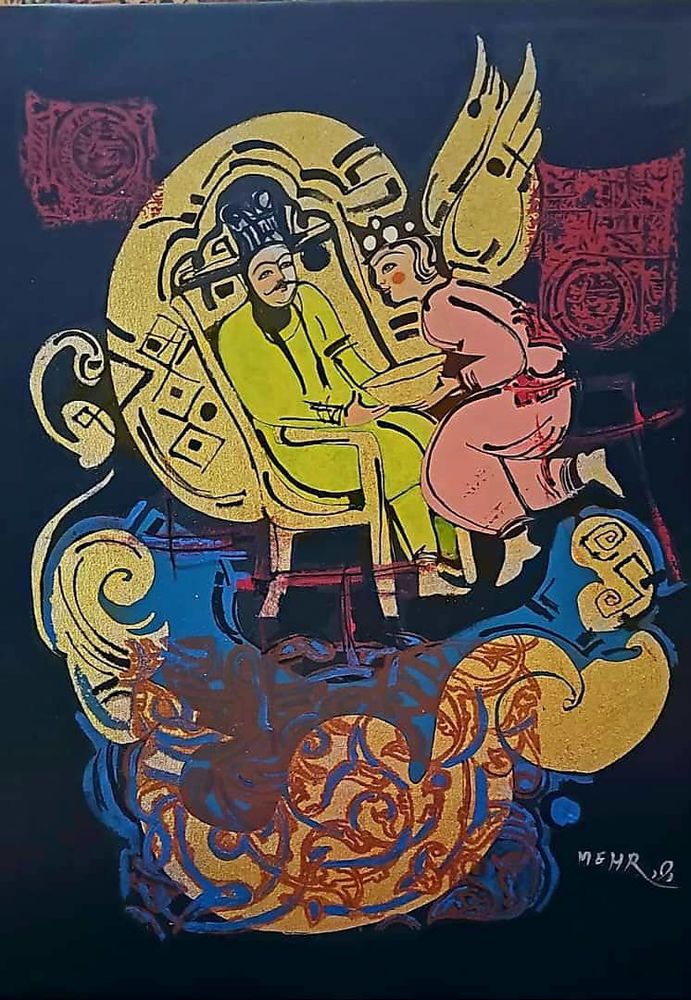 His paintings have been shown in England, Switzerland, Italy, Belarus, Cyprus, Turkey, the United States (Los Angeles), Dubai, and of course Iran. Fallah’s entry into the art world dates back to 1998, at the age of 23, when he presented a reverse-glass painting exhibition at Gallery 66 — an influential space founded by Sadegh Tabrizi. He later held six solo exhibitions, among them the widely noted “Lion with Calligraphy” show at Art Center Gallery in 2015.