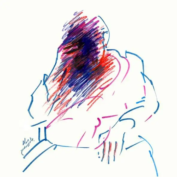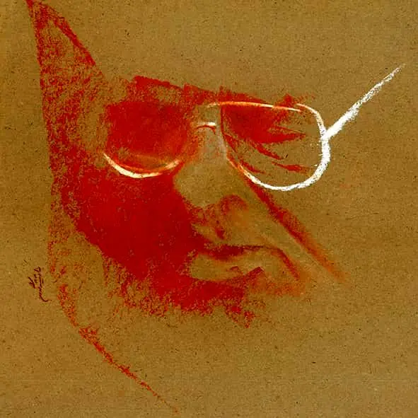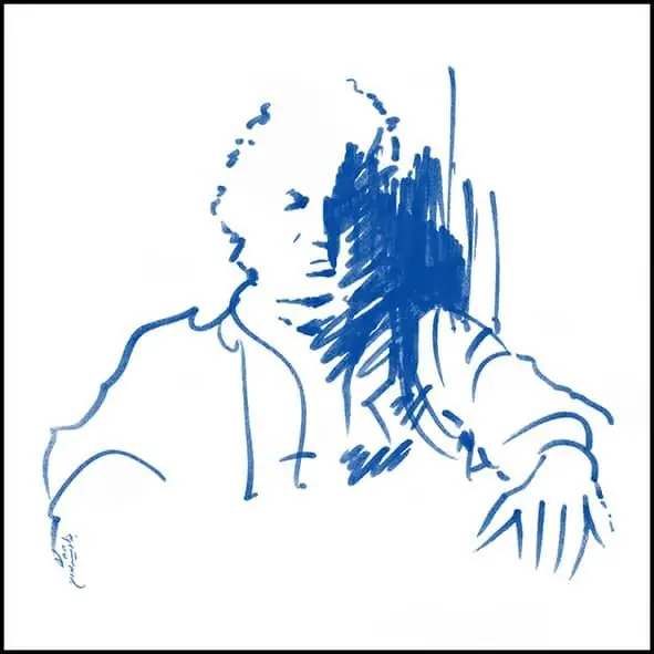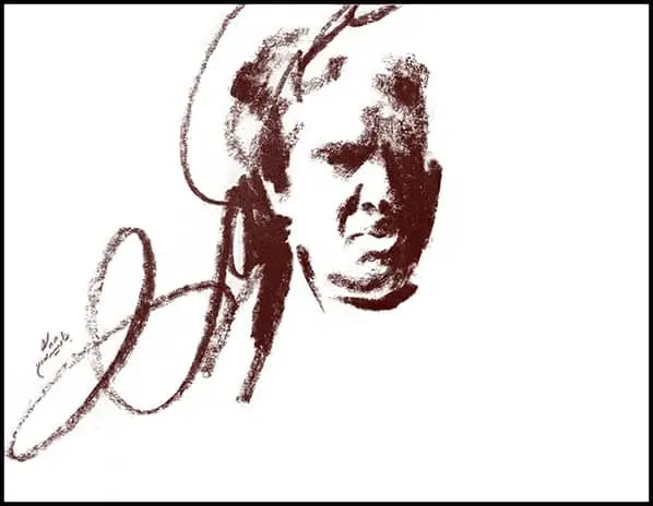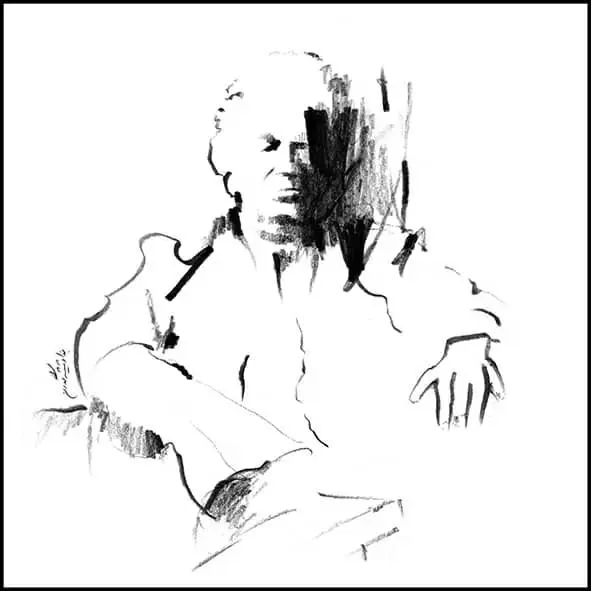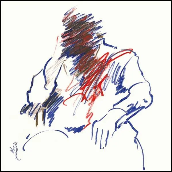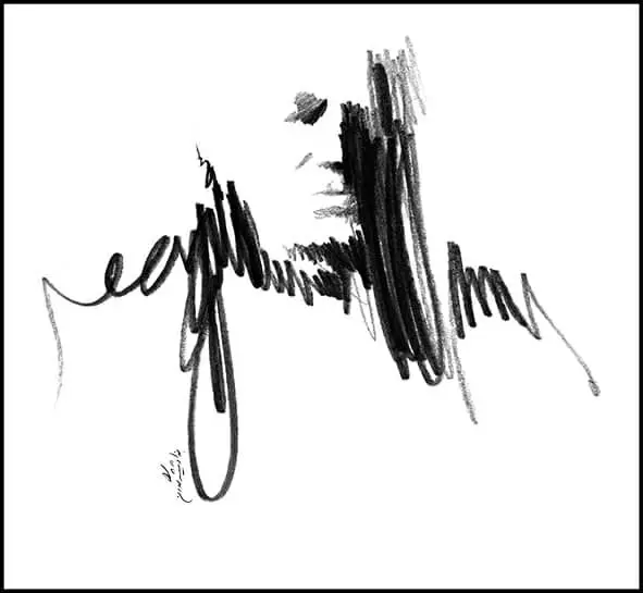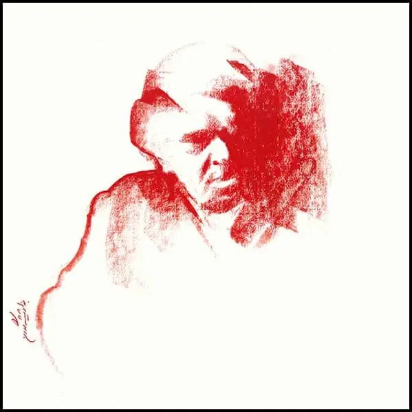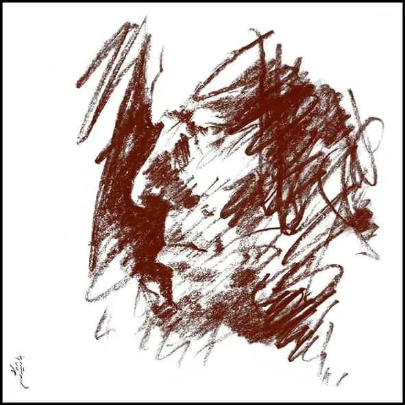 Formally, line is the dominant element across the series: a free line—at times calm, at times harsh and fractured—moving between drawing and writing. These lines do not merely delineate facial boundaries, nor do they remain faithful to them; instead, they resemble traces of sound or echoes of speech. In these works, Shamlou’s face is more often “written” than “drawn,” a quality that directly references his identity as a poet, as if the portrait itself emerges from language.