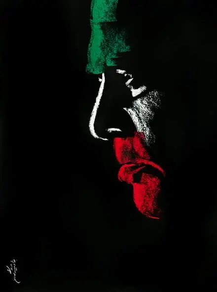 Color plays a symbolic and ideological role in the series. In some portraits, the three colors of the Iranian flag appear prominently, emphasizing Shamlou’s deep attachment to his homeland. In works with red backgrounds, color manifests as passion and resistance—red evoking both political protest and the emotional intensity of Shamlou’s poetry. These portraits clearly activate Iran’s contemporary collective memory, elevating Shamlou’s image from that of a literary figure to a historical and social signifier.