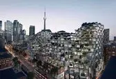طراحی نمای مجتمع مسکونی-تجاری تورنتو از متریال آجرهای شیشهای، بتن سفید و شیشه به همراه بافت سبز تشکیل شده است.