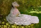 تابلو نقاشی «به وقت بهار» اثر «کلود مونه» همسر این نقاش را به تصویر میکشد که در سایه یاس بنفش مطالعه میکند.